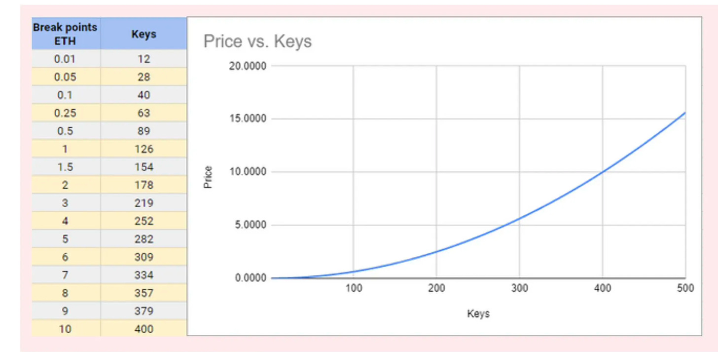 Friend.tech 主要功能是通过 keys 来访问独家内容或进行交互,其中 keys 的价格采用「bonding curve」机制设计,即随着购买量的增加呈指数级增长。具体的计算公式为二次方程式:下一个 key 的价格=(当前 key 数量)2/ 16000 x 1 ETH。