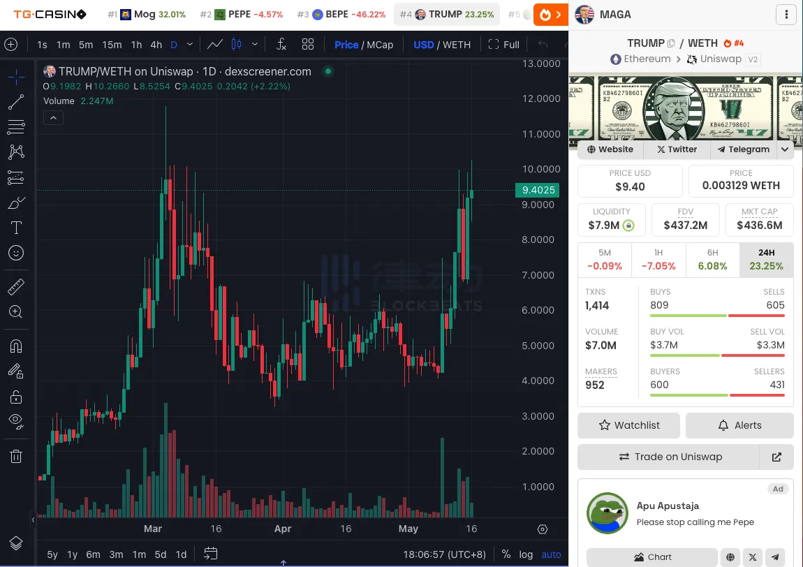 目前来看,MAGA($TRUMP) 是目前最强劲的美国大选概念 Meme 币之一,一直持续上涨,在撰稿时间 5 月 16 日突破 10 美元,现报 9.89 美元,24 小时涨幅达 29.7%。据 dexscreener 数据显示,MAGA($TRUMP) 的市值为$436.6M。