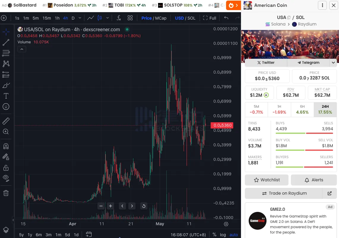 截至撰稿时间,据 dexscreener 数据显示,$USA 市值为$62.7M。