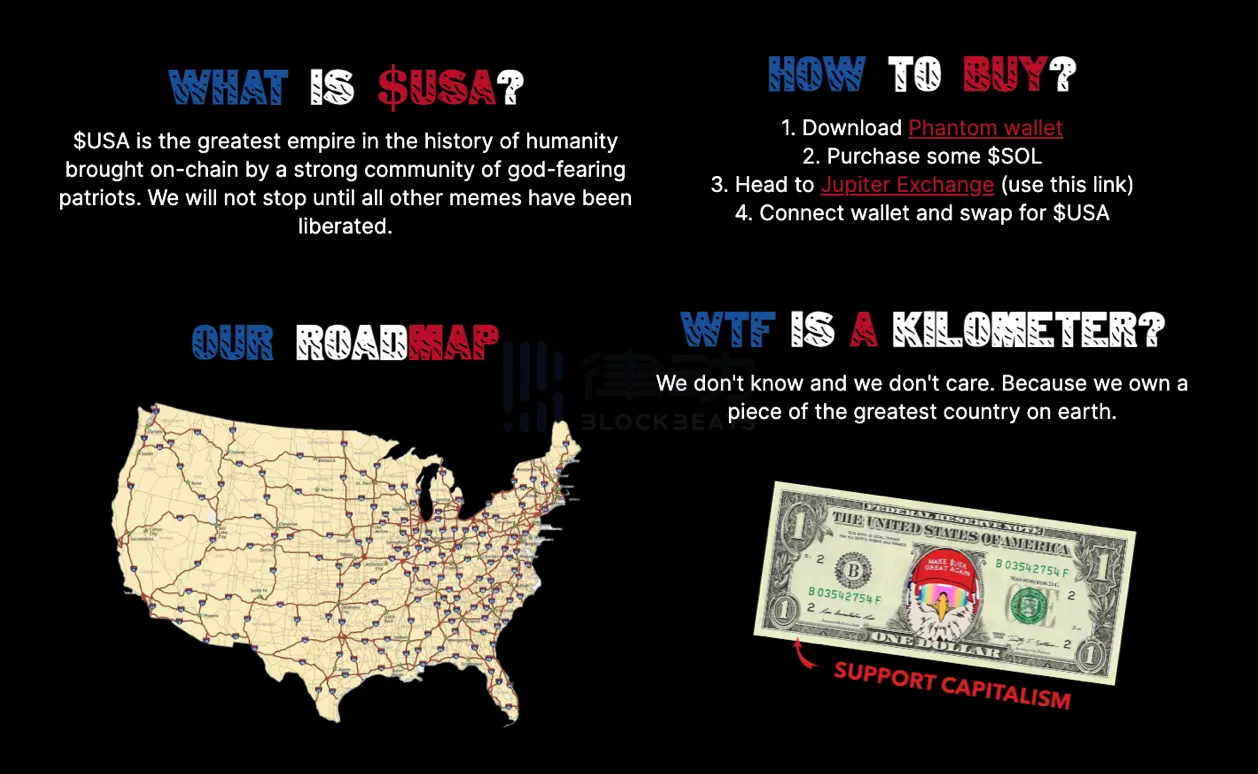 「今天是星期一,11 月 4 日。鸡蛋一箱 20 美元。平均房价从 100 万美元起步。婴儿潮一代偷走了你的未来,而你却住在 400 平方英尺的蟑螂窝里,听着政客们告诉你只要拥有博登并且幸福。这是一个没有真正美国人想要的未来。这就是为什么$USA 在这里。$USA 存在是为了对抗这样的未来。$USA 不是一个政治代币。它是一个号召,一场文化复兴。$USA 代表你,那些想要通过加密货币的力量重塑美国之美的人。」