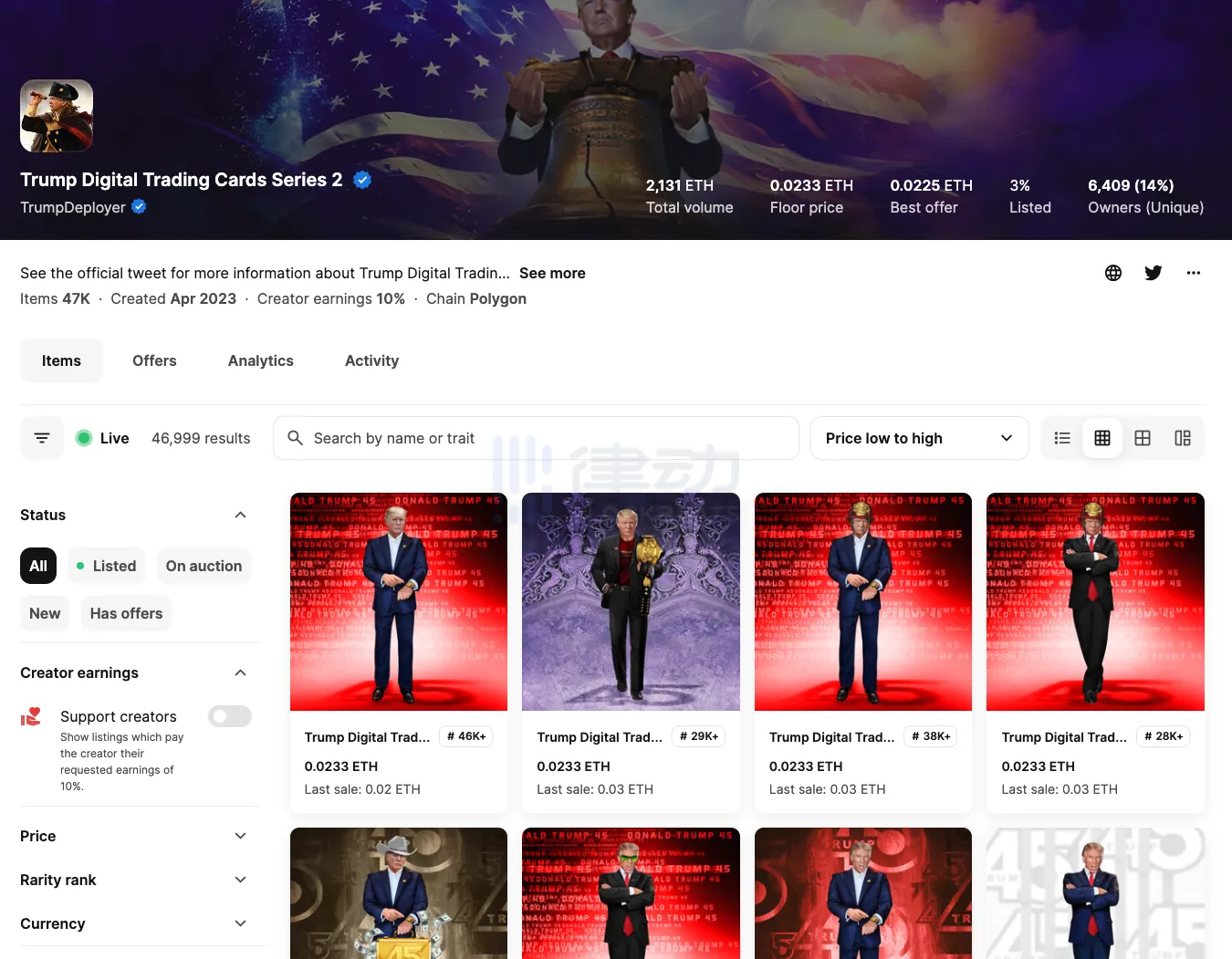 截止撰稿时间,据 OpenSea 数据显示,,Trump Digital Trading Card 第二季地板价为 0.02ETH。