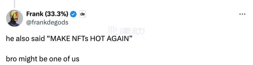 DeGods 创始人 Frank 作为美国 NFT 社区知名创始人及 KOL 也参与了这场晚宴,在上述视频外 Frank 还在自己的 X 帐号上发布了另一条活动现场视频,视频中特朗普表示「要让 NFT 再次火热起来」。