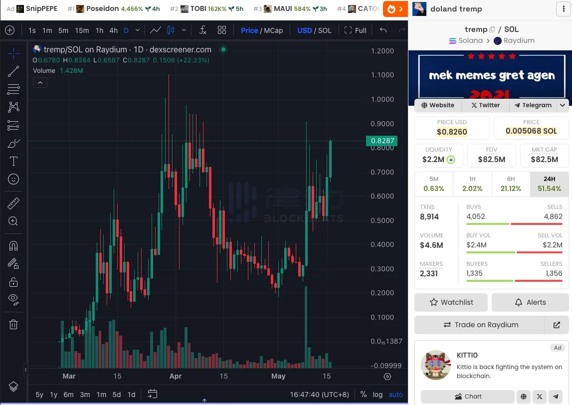 截至撰稿时间,据 dexscreener 数据显示,Doland Tremp ($TREMP) 的市值为$82.5M。
