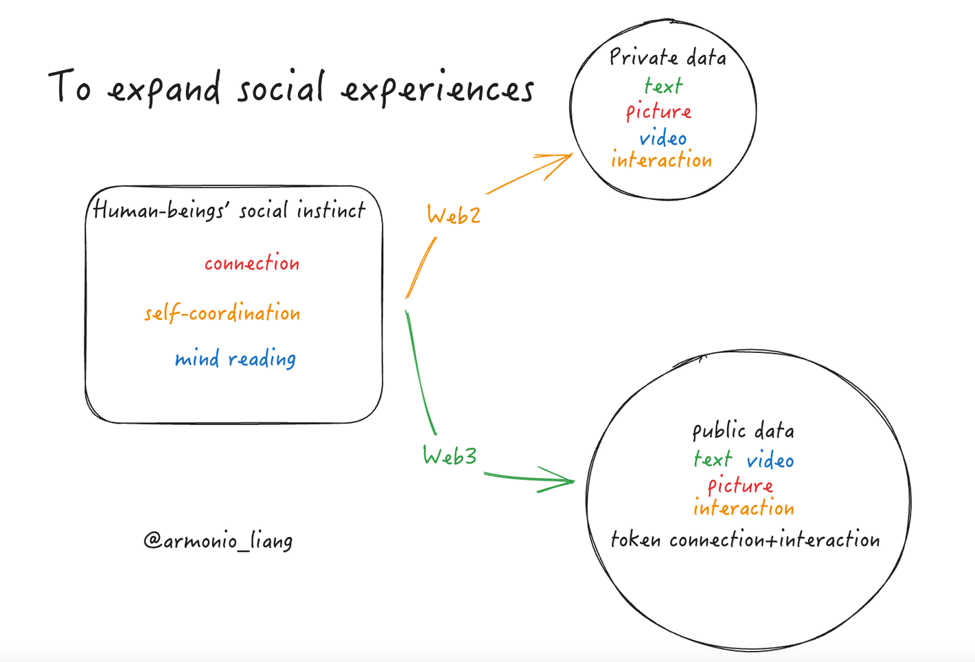 Web3 的发展走向从概念提出就已经定下,一言以蔽之,就是可信的开放数据环境所支持的产业生态以及用代币支撑的金融环境。这样的环境如何孕育出全新的产业格局?以跨数据库、跨组织的底层信息支持,自由选择前端的,可组合插拔式的社交界面是 Web3 社交的独特优势。代币是 web3 的典型特征,用社交支持代币发行,以代币量化的权利互动为内容核心,组织社交关系的场景是 web3 社交的独特应用场景。