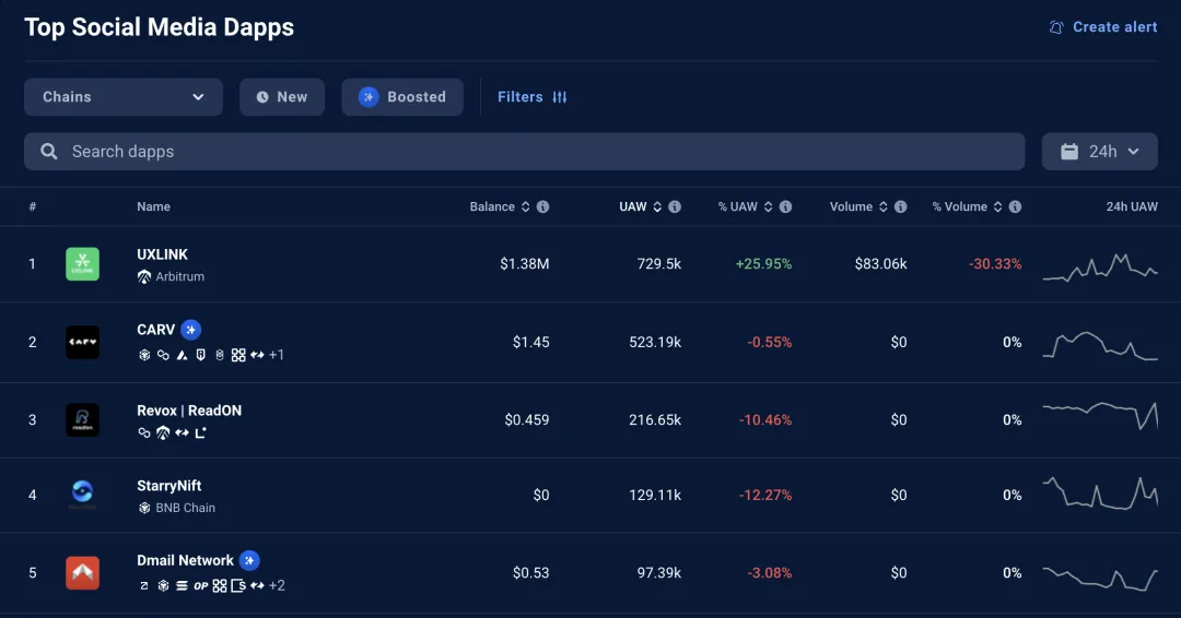 综合来看,UXLINK无疑是当下最火爆的区块链社交基础设施,链上的活跃度也远超其他三位SocialFi领域的主要竞争对手。根据UAW(Unique Active Wallets)来看,UXLINK的活跃钱包数量高达729.5k,在所有Social Media Dapps中排名第一。