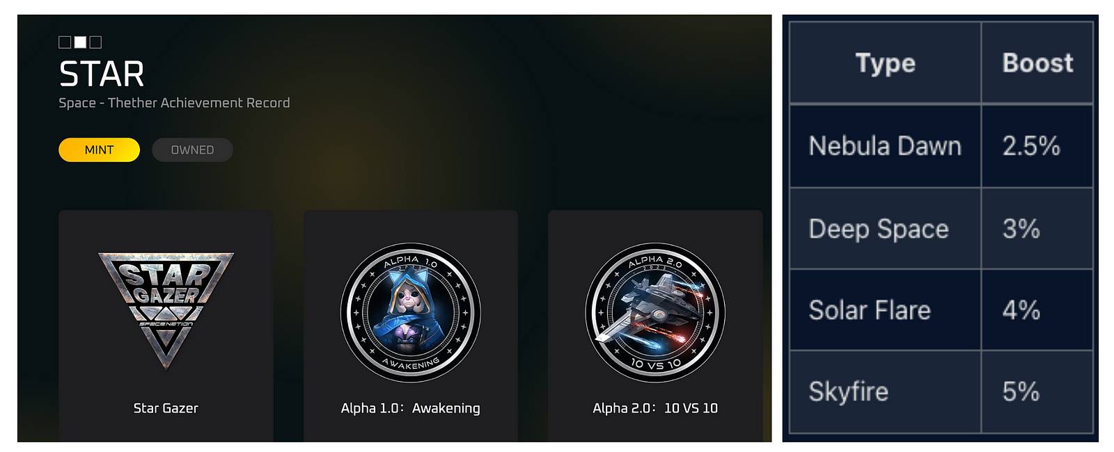 那么 Space Nation 是怎么做的呢?作为深耕 Web2 游戏多年的团队,成就这块早就玩明白了。系统有一个成就系统,完成成就可以在每个周期享受来自成就部分的加成,这是很明确的固定奖励。