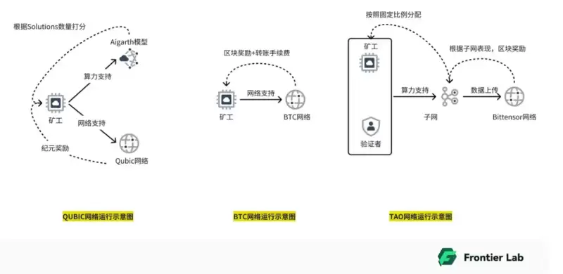 Qubic 网络与 Bittensor 网络运行模式类似,代币奖励主要用于奖励为 AI 模型提供算力的矿工,两者都是对比特币理念的升级,长期以来比特币网络因消耗大量算力资源用于网络保护而饱受诟病,Qubic 和 Bittensor 将 AI 概念融合到 Pow 挖矿网络,让算力变得「有用」。三者运行机制对比如图 1–1 所示。