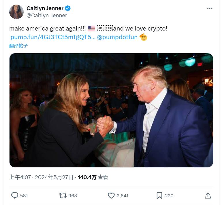 凌晨 4 点左右,Caitlyn Jenner 的推特账号 po 出一张与特朗普握手的照片配文“make america great again!!! and we love crypto!” 并附 pump.fun 的 $Jenner 代币链接。 紧接着 Caitlyn Jenner 又在推特上圈出 Ansem、SolJakey、Pauly 几位著名加密 KOL 并称其为“crypto kings!”。