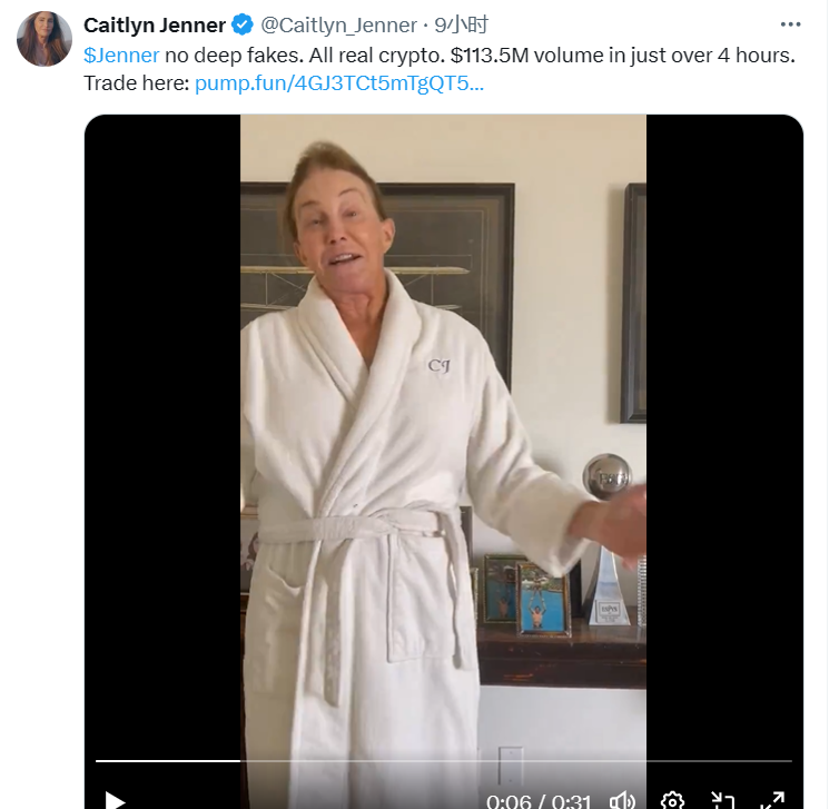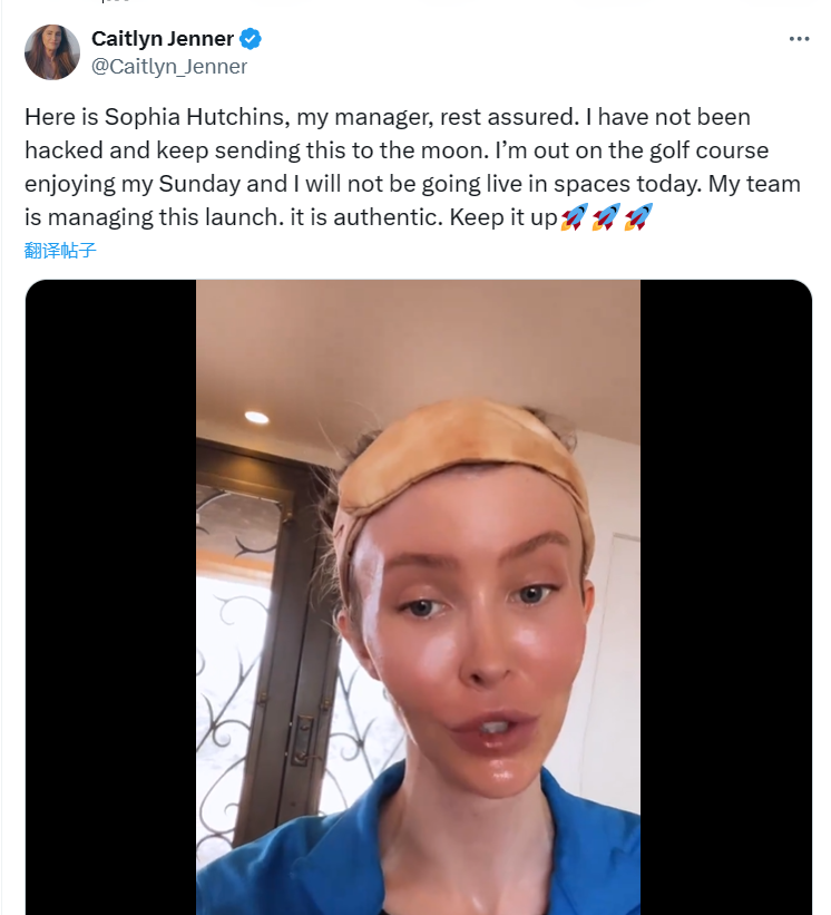 紧接着 Caitlyn Jenner 又在推特 po 出一条本人露脸视频表示 $Jenner 确实是本人团队发布,她本人当前正在打高尔夫所以暂时无法出面。