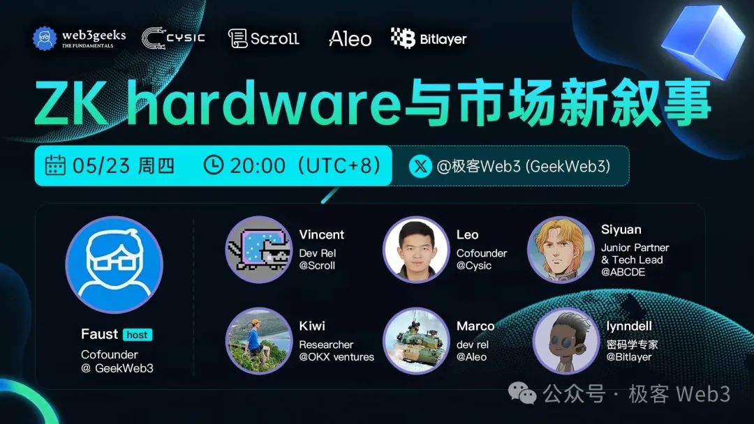 摘要:5 月 23 日晚,极客 Web3 邀请了Scroll、Cysic、Bitlayer、Aleo、ABCDE Capital 和 OKX Ventures 的嘉宾就 ZK 硬件加速的话题进行了推特 Space,嘉宾们围绕 ZK 证明实时生成及硬件加速在商业化和市场化上的问题进行了极其精彩的讨论,还针对新名词“ZK Depin”进行了头脑风暴,以下是文字版记录。