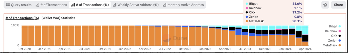 今年牛市以来,活跃在大众视野里的钱包项目还有很多,像是 Backpack、Venom、Uniswap,还有刚起步的 Binance Web3 等等。但是纵观整个钱包赛道,曾经的王者 MetaMask 看起来体力不支,只见 Bitget Wallet 和 OKX Web3 齐头并进,把其他对手甩出远远一大截。考虑到钱包产品对技术积累的要求,实在难以想象还有哪位选手能插入这两位新王的竞争,但同时也很期待未来谁能引领钱包的下一个发展方向。