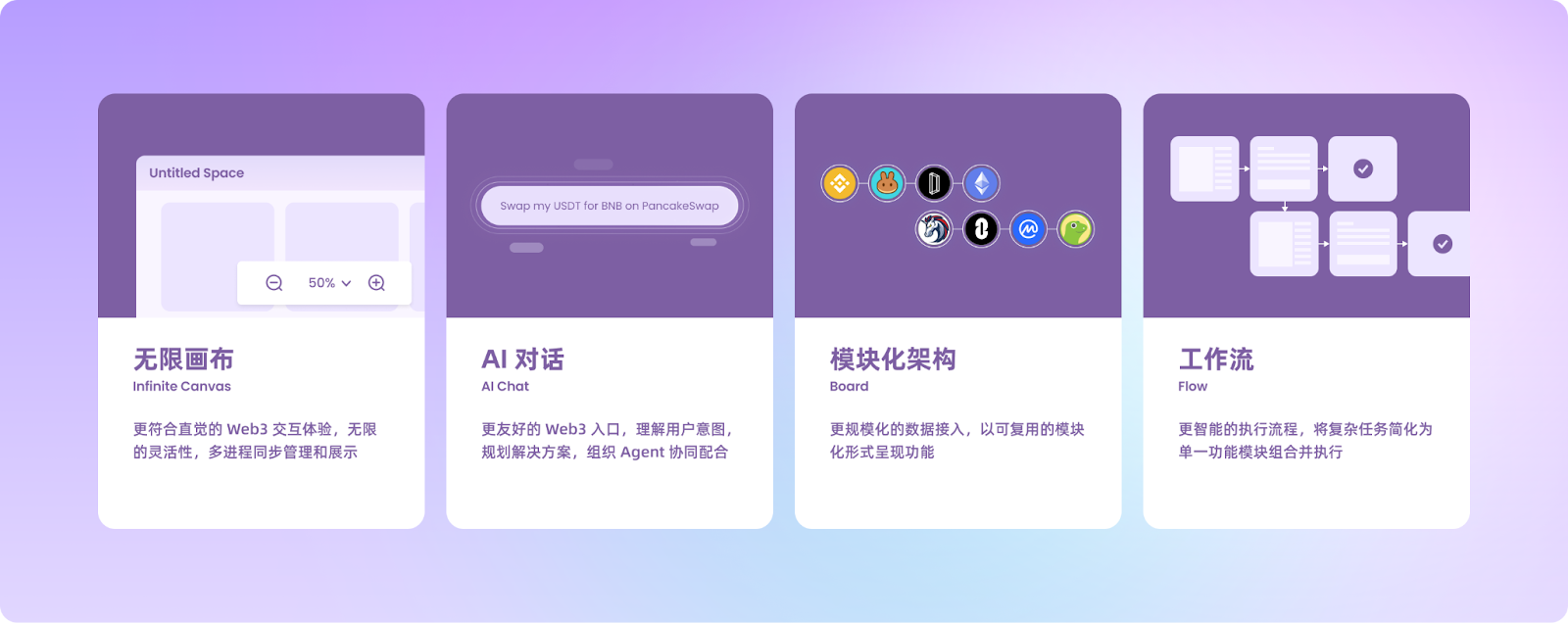1. 无限画布 (Infinite Canvas):更符合直觉的 Web3 交互体验,无限的灵活性,多进程同步管理和展示