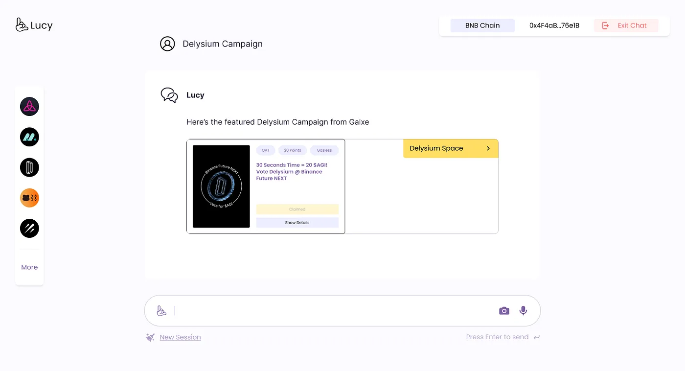 在进入主聊天窗口后,用户可以直接向 Lucy Beta 传达意图和目标。例如,输入 “帮我质押 AGI” 或 “我想参加 Galxe 上最热门的活动”。