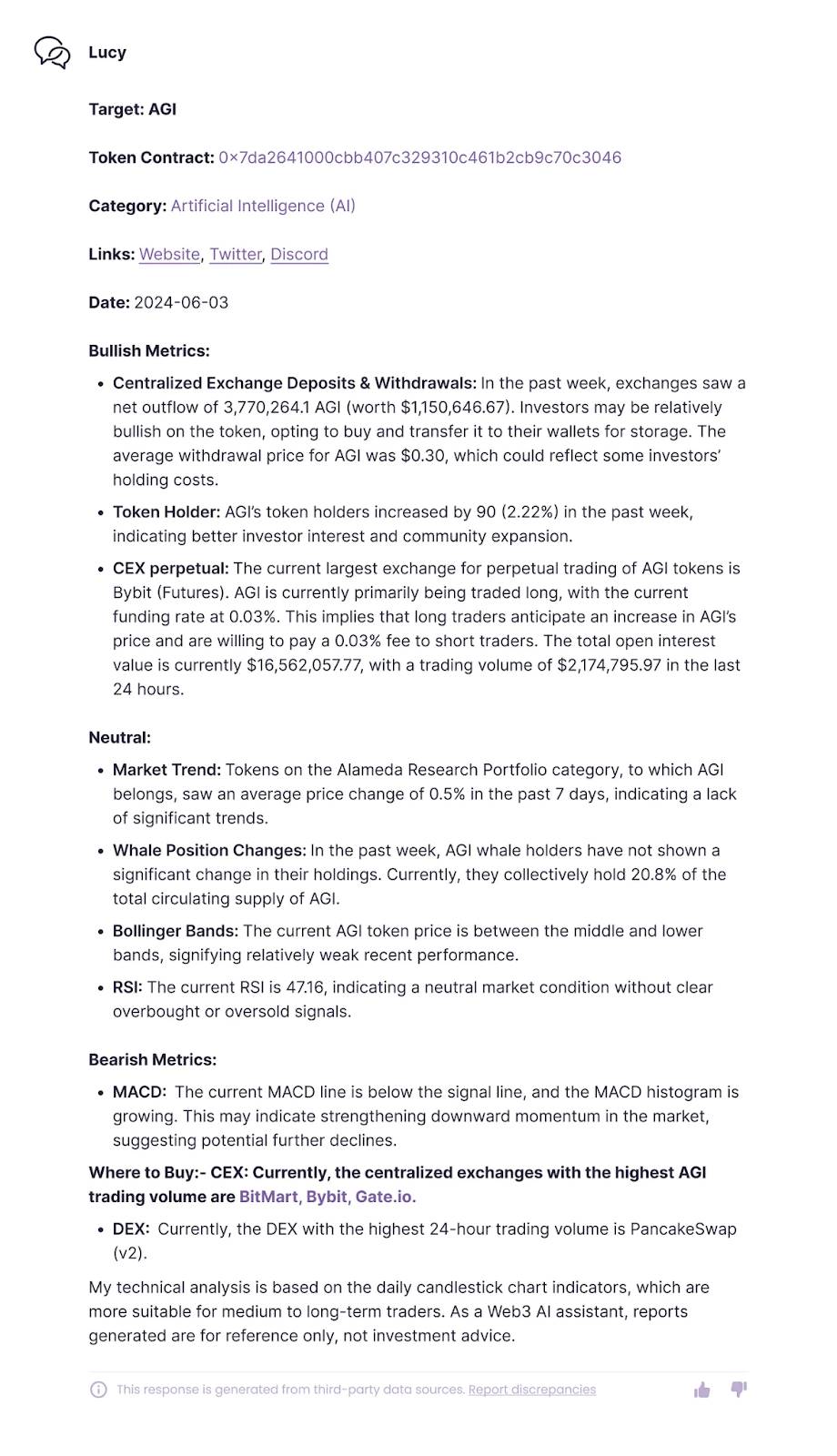 除了像 Galxe 这样的应用平台,Lucy Beta 还集成了多个知名数据源,如 0xScope、0x、1inch、CoinGecko 等,确保用户通过 AI 对话获得最准确和最新的信息,从实时市场趋势到深入的项目或代币数据分析。