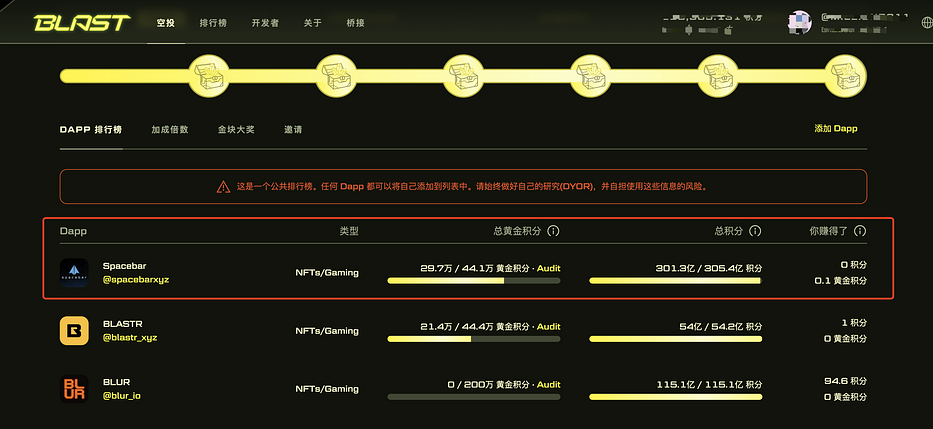 除了以上主线玩法外,Spacebar 本身还出了每日签到拿积分活动,这个积分貌似也和 Blast 生态的积分有关,因为我个人体验签到一周后,在 Blast 生态上就有黄金积分了。除了签到,也可以在 Spacebar 里进入 Stake,质押你的 ETH,也会获得 Spacebar 和 Blast 生态的双重积分。