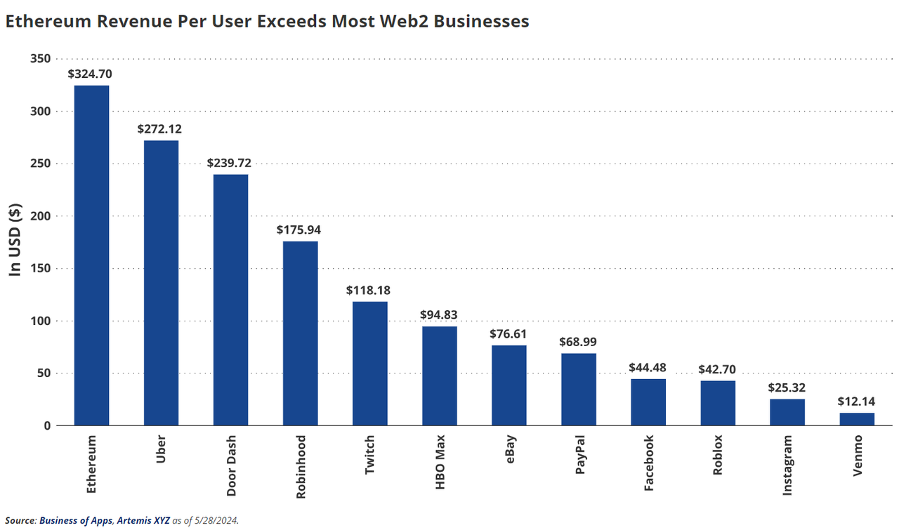 与 Web2 应用程序相比,以太坊 ( 34 亿美元) 产生的收入高于 Etsy ( 27 亿美元)、Twitch ( 26 亿美元) 和 Roblox (27 亿美元)。以太坊 (2000 万) 的月活跃用户数比 Instacart (1400 万)、Robinhood (1060 万) 和 Vrbo ( 1750 万) 还要多。此外,以太坊月活跃用户的平均年收入为 172 美元,与 Apple Music 的 100 美元相当。Netflix 是 142 美元,Instagram 是 25 美元。我们将以太坊归类为类似于 Apple App Store 或 Google Play 的平台业务。然而,以太坊比 Web2 平台具有很大的优势,因为它为用户和应用程序企业主提供了加密货币之外无法获得的独特价值主张。