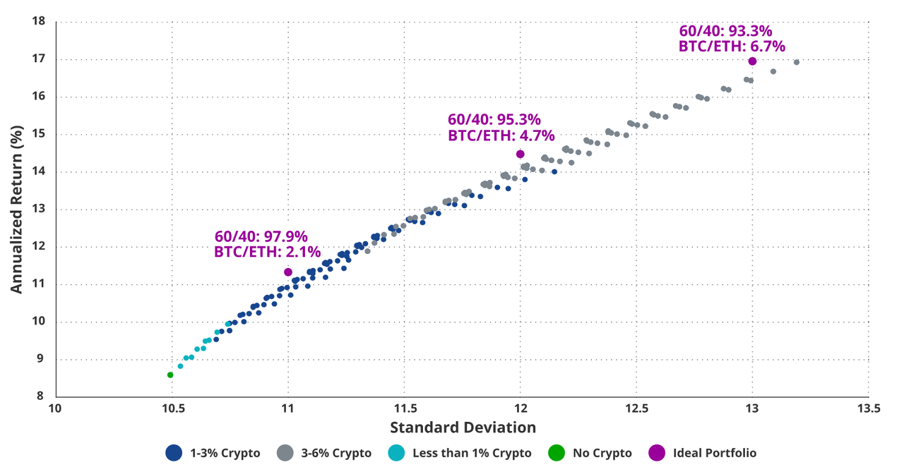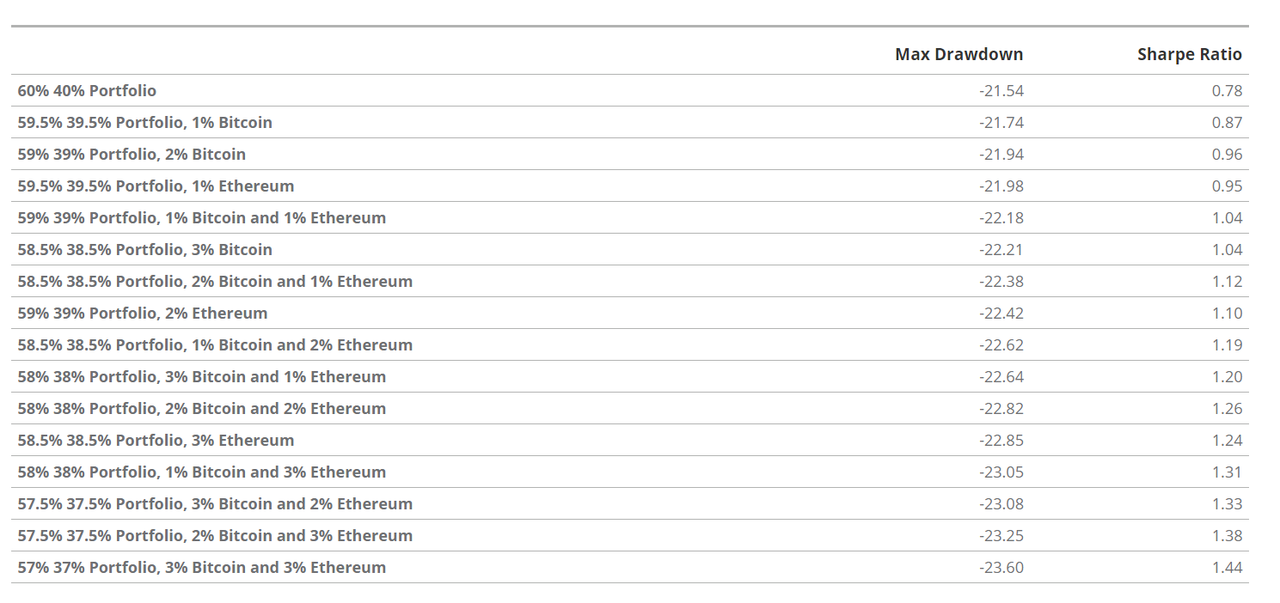最大回撤和夏普比率的数据显示,6% 的加密货币分配导致夏普比率几乎是 60/40 投资组合的两倍,而回撤仅略有增加。这强调了在将 BTC 和 ETH 添加到传统投资组合中时非常有利的风险回报权衡。