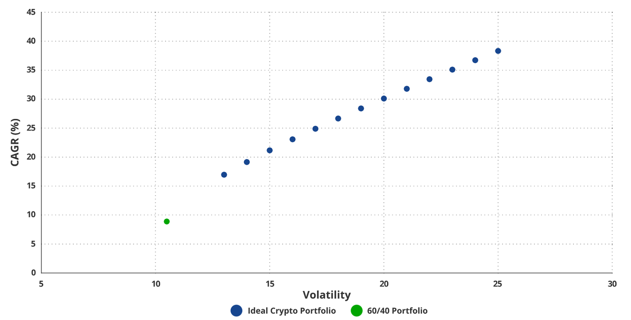 使用最优加密货币投资组合计算有效前沿:我们研究了理想 BTC/ETH 投资组合的最佳权重,以在给定不同波动水平的情况下最大化回报,以说明将加密货币添加到 60/40 时有效边界的一部分(具有合理的波动率水平)。
