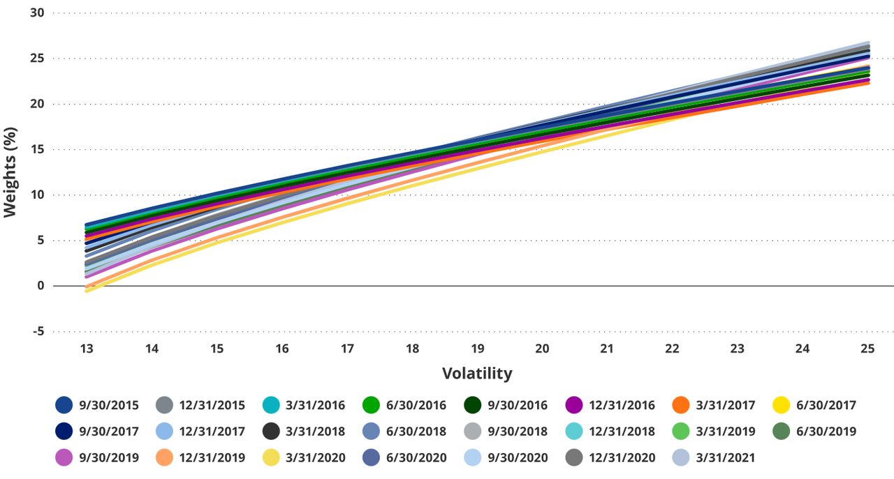 理想加密货币投资组合的最佳权重随着所有时间段的风险增加而增加。