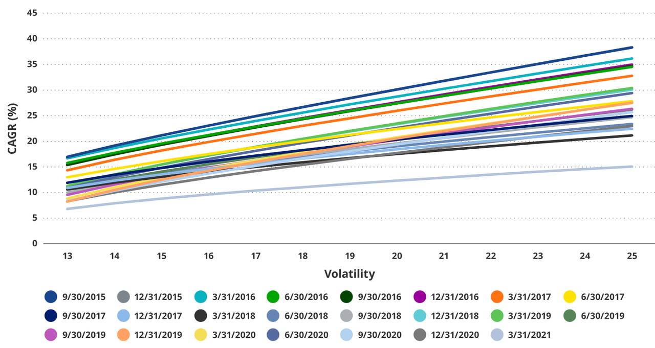 为了确定不同的起点是否对组合的理想加密货币和 60/40 投资组合的风险 / 回报状况有影响,我们重复了第 4 部分中的分析,同时反复将起点向前移动了 1 个季度。我们唯一的限制是包括至少 3 年的回报。因此,我们能够产生 23 组结果,并从分析中去除时间依赖性作为变量。