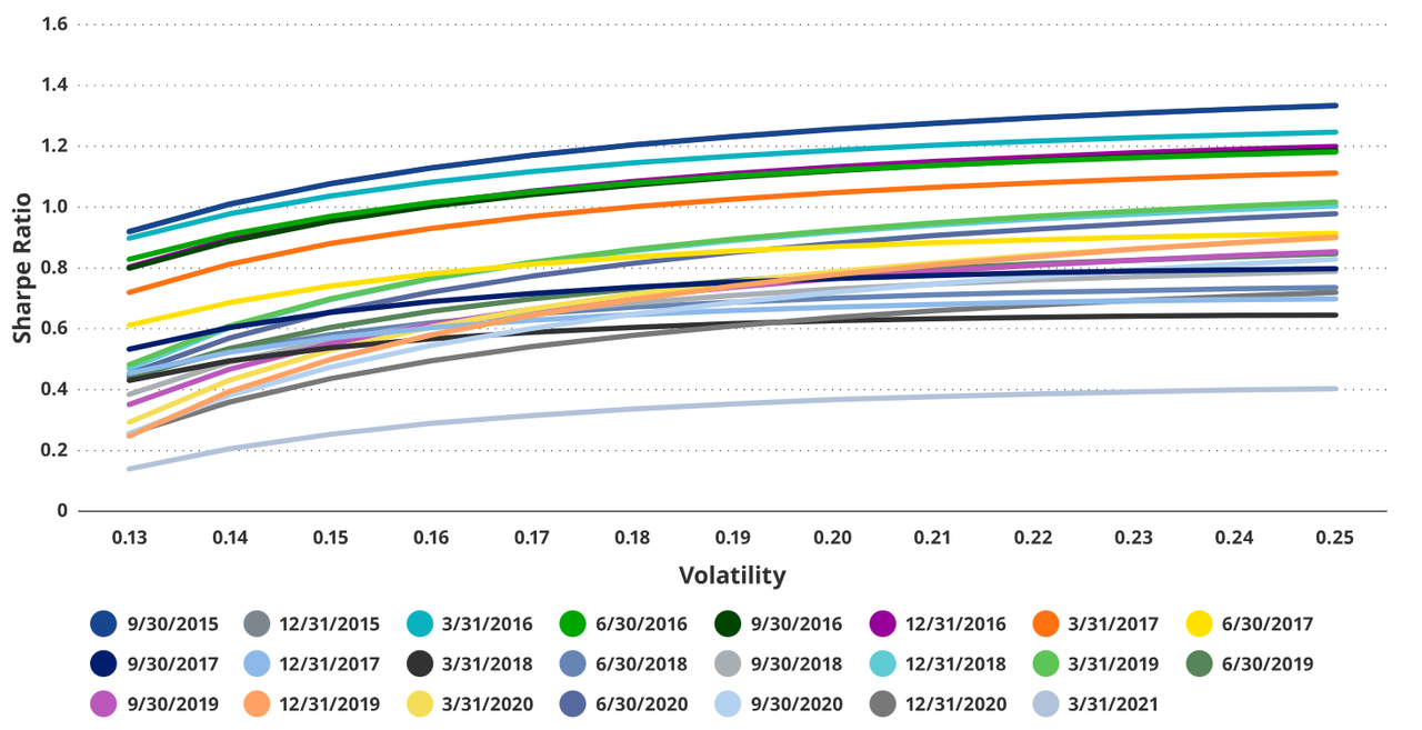 有效前沿结果的时间依赖性:我们考虑了不同起点对研究结果的影响。表明更大的加密货币配置有助于在每个可用时间段内获得投资组合风险调整后的回报。
