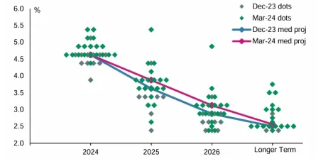 鸽派情形:在更新的点阵图中,2024年末中位数为三次降息