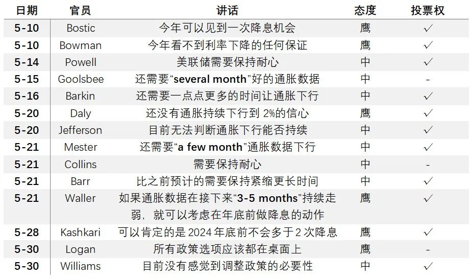 经济预测更可能偏向于下行:5月以来,美国经济数据普遍弱于预期。美国一季度GDP已经出现下调、近期零售、工业产出、PMI、JOLTS职位空缺、ADP就业人数等数据普遍调整,非农就业人数虽超预期,但前月数据下修、家庭调查失业率连续上升,仍使得今年的增长预测可能会出现小幅下调。