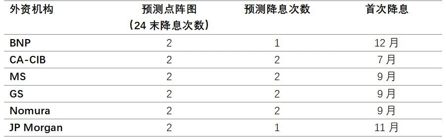 目前,主要外资金融机构预测结果为:2024年点阵图上调25bp(年内降息2次),关于年内降息次数和首次降息时间的差异分歧较大。