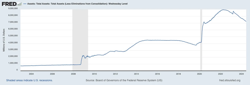 虽然自紧缩政策开始以来,美联储已经成功地将其资产负债表缩减了约 1.7 万亿美元,但 M2 货币供应量仍接近历史最高水平。
