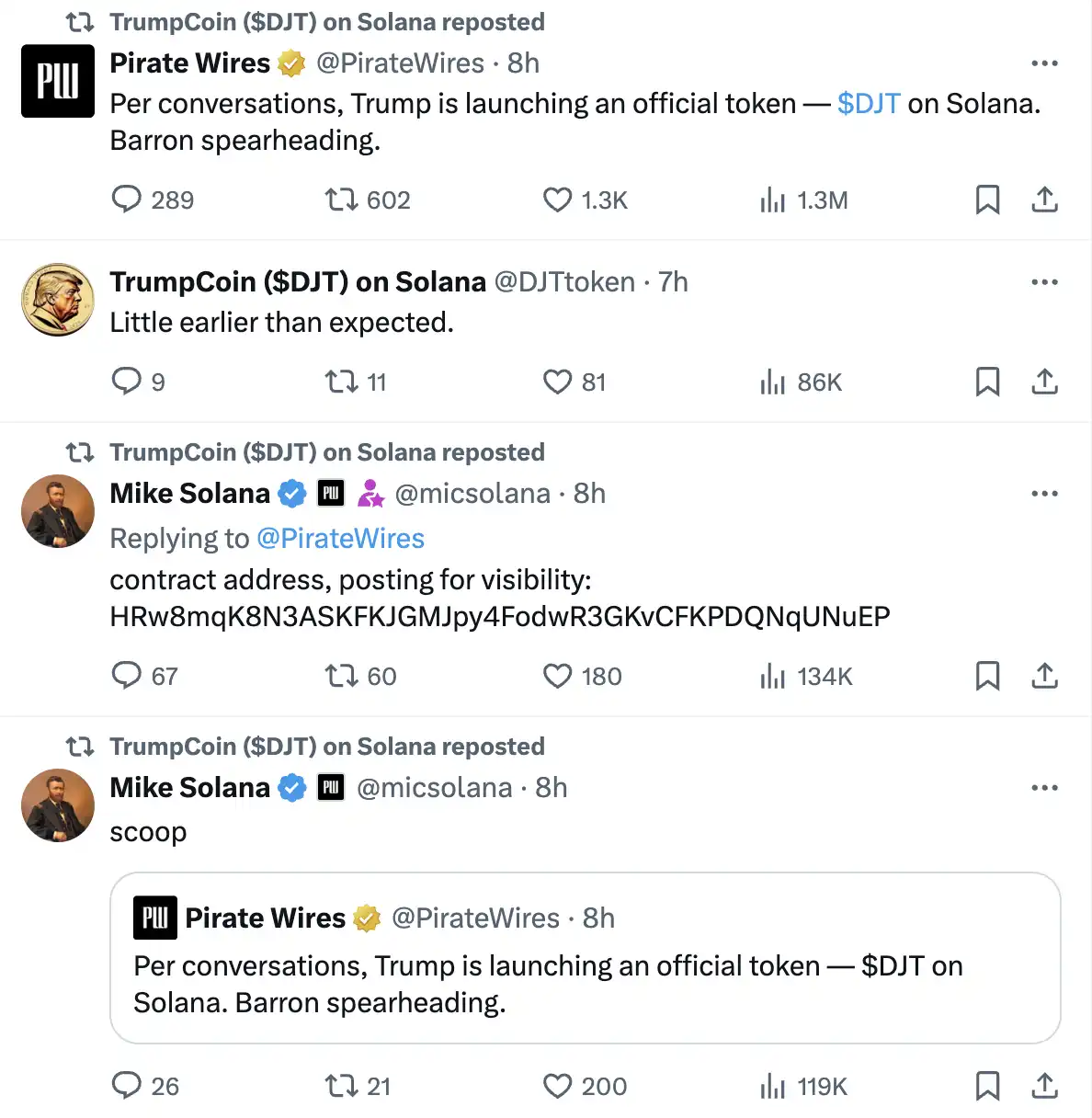 而此次事件的唯一信源 Pirate Wires 在之后没有放出更多讯息,其主编同时也是 Founders Fund 的 CMO Mike Solana(本人表示 Solana 是他的姓)则转发了原帖并放上了代币合约地址,而同时间诞生的$DJT 官方推特也与其互动密切。