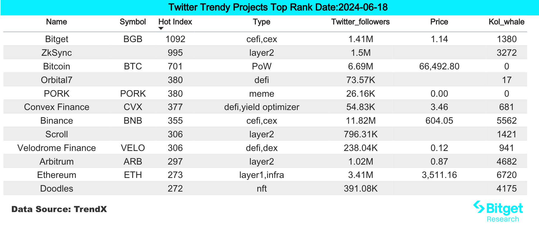 - 用户热搜代币&话题为: CARV、ZKsync、BGB、Velodrome