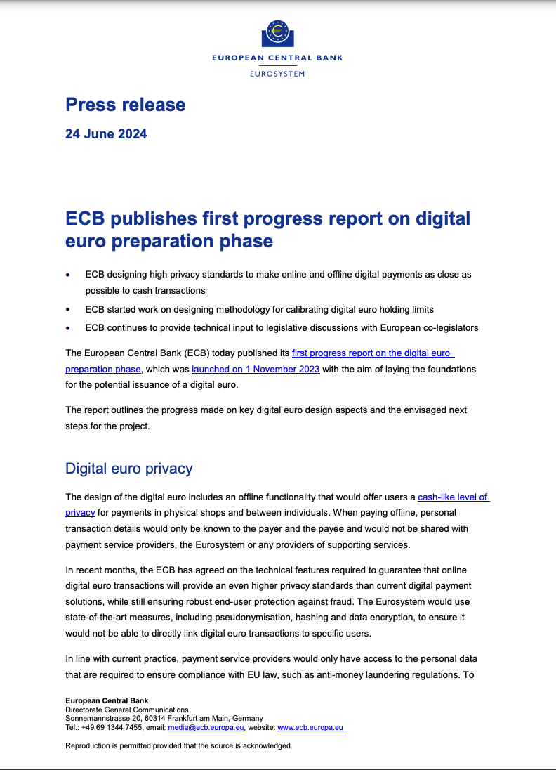 欧洲中央银行(ECB)在 6 月 24 日的更新中发布了关于开发央行数字货币(CBDC)的首份进展报告。