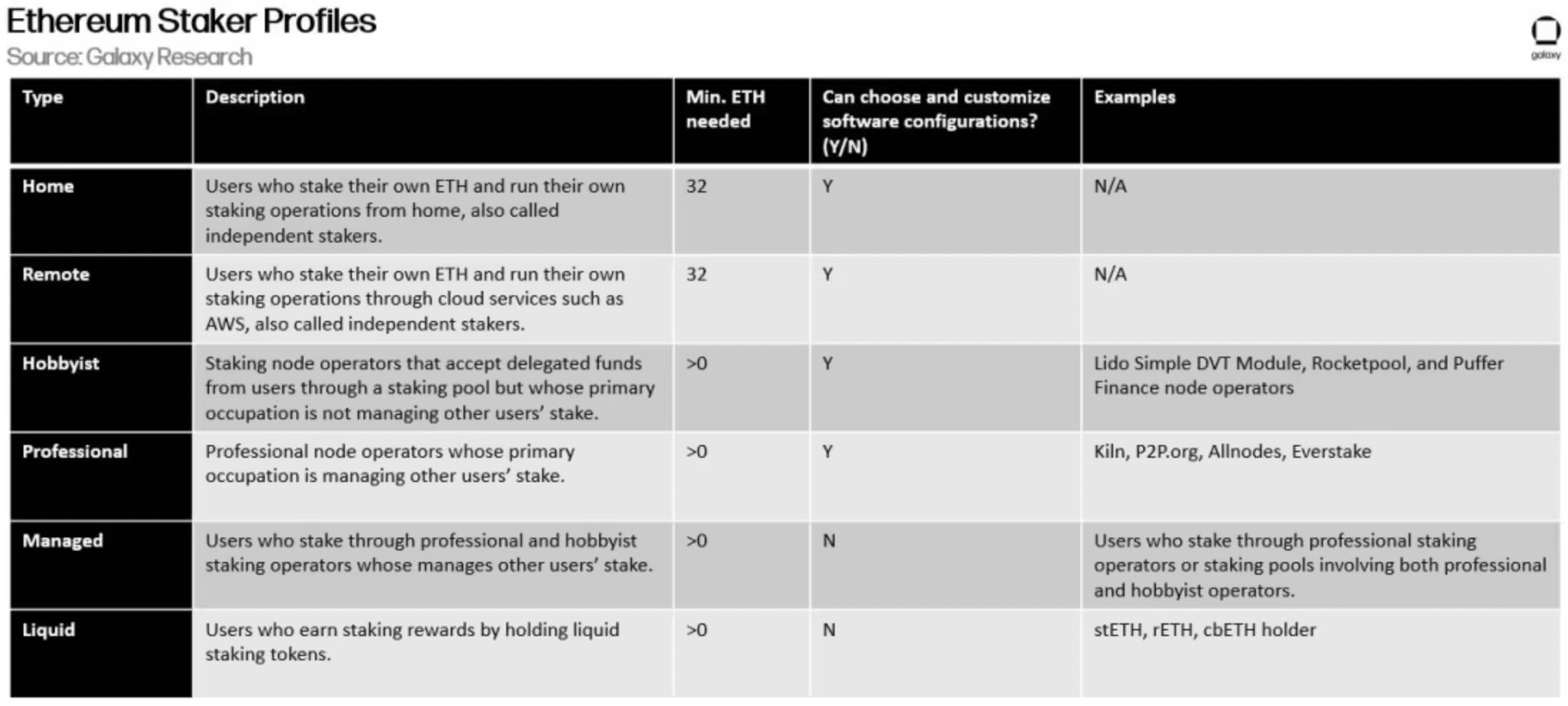 有六种主要类型的以太坊用户可以通过质押获得奖励。下表详细列出了他们各自的概况: