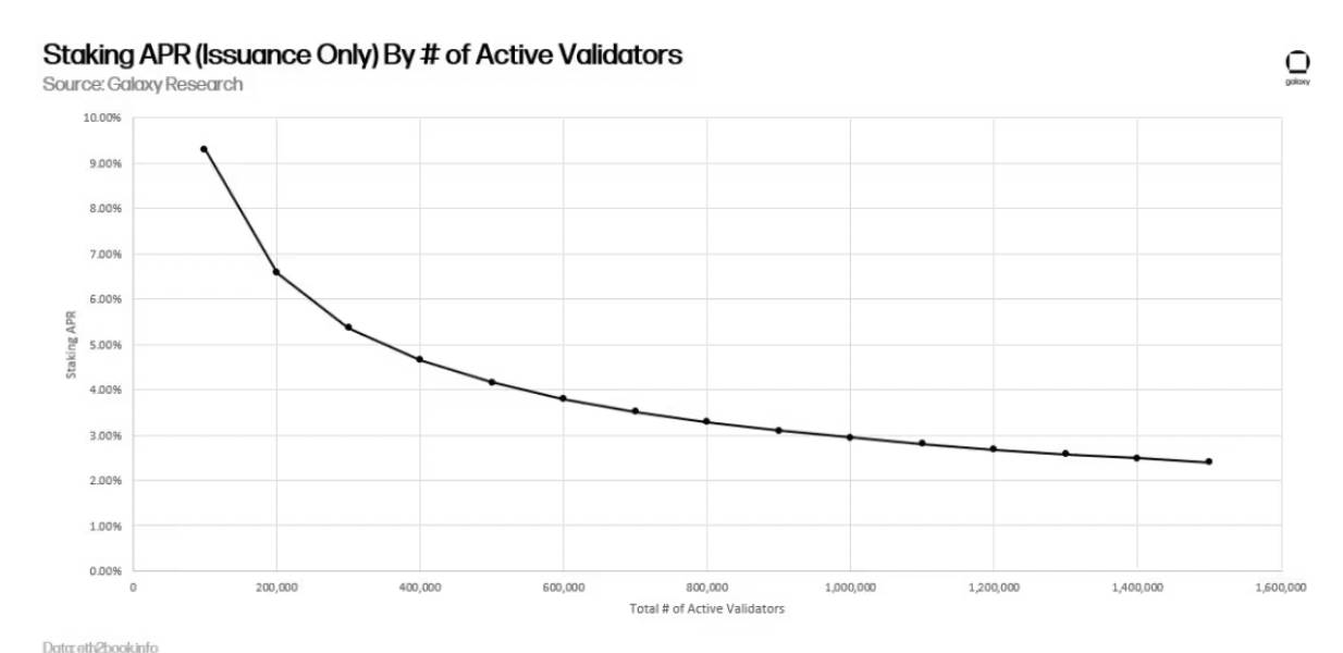 请注意,在过去 2 年中,质押者的奖励一直在稳步下降,这主要有两个原因。首先,质押的 ETH 总数以及验证者的数量有所增加。当质押的价值增加时,验证者的发行奖励被稀释,如下图所示: