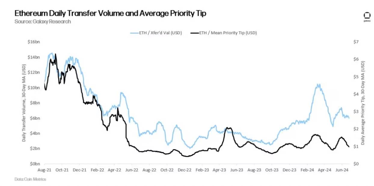 过去两年,交易活动有所减少,导致验证者的基本费用、优先费用和 MEV 减少。通常,链上转移的资产价值越高,用户支付小费的意愿就越高,以便在下一个区块中优先处理这些交易,而搜索者从区块内的重新排序中获利的 MEV 就越高。如下图所示,以太坊每日转移的美元价值与交易优先费相关: