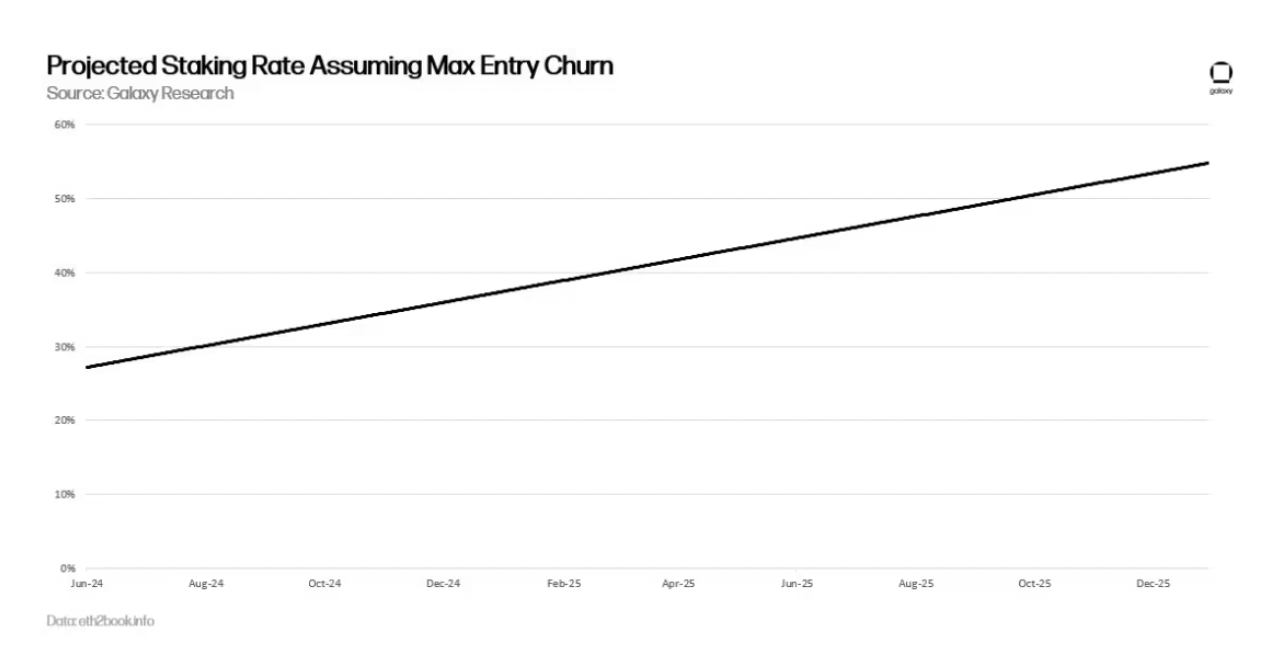 假设以太坊上的质押需求像过去两年一样呈线性增长,那么预计 2024 年的质押率将超过 30%。如本报告前面所述,更高的质押率将减少新 ETH 发行带来的回报。以太坊上的流动质押服务使用户可以轻松质押并绕过入场队列等质押限制。用户只需购买 stETH 即可获得质押回报。大量购买 stETH 会导致公开市场上 stETH 的价值与基础质押资产的价值失衡,进而导致 stETH 溢价,直到以太坊上质押更多 ETH。与购买 stETH 不同,以太坊上的质押活动会有所延迟。每个 epoch(即 6.4 分钟)只能向以太坊添加 8 个新验证者或最多 256 ETH 的有效余额。因此,假设从现在到 2025 年底每个 epoch 的验证者数量都达到最大值,那么以太坊将需要一年多的时间(准确地说是 466 天)才能达到 50%的质押率。