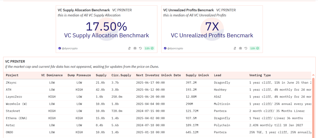 但有意思的是,Dune 统计数据显示,即便是在市场遭遇持续下跌的状况下,各大 VC 在这些 Token 的投资上账面价值仍有着数十倍甚至近百倍的浮盈,VC 整体的未实现利润仍高达 7 倍。