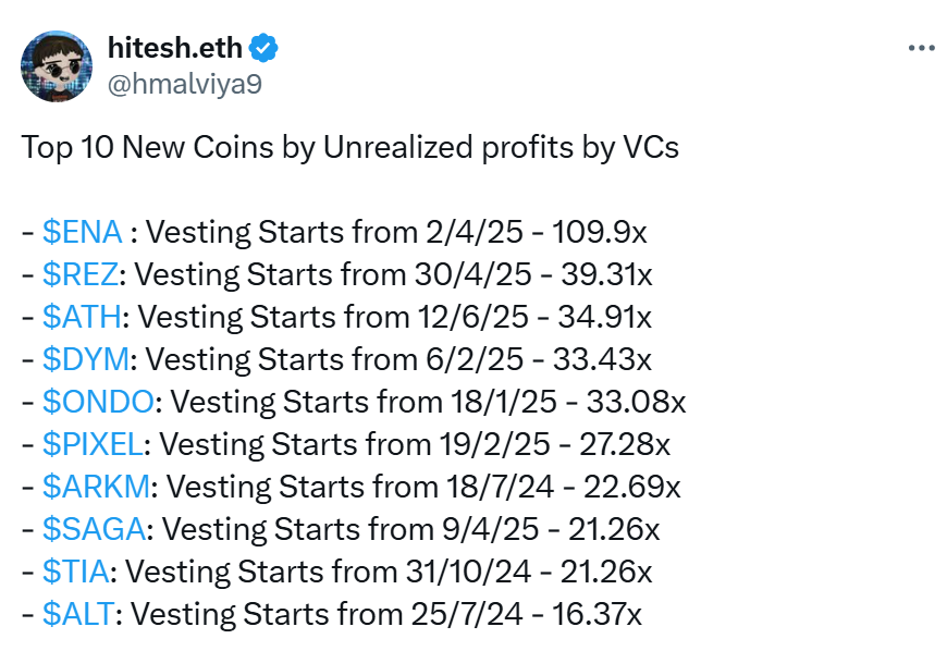 但与此同时, 诸如 ENA、DYM、SAGA 等虽然让二级市场投资者损失惨重,VC 却仍然能够锁定 10 倍以上的利润——最高的 ENA 回报率高达百倍左右,最低的 ALT 也有 10 倍以上,VC 与二级市场投资者的体感可谓「冰火两重天」。