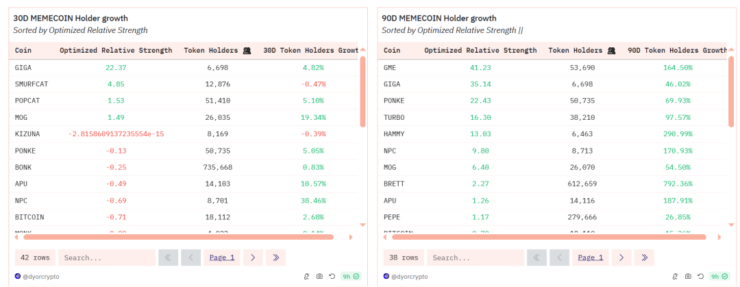 46 个 Memecoin 中,除了 4 个属于增长颓势外(其中 FLOKI 仅是微降),剩下 42 个 Memecoin 的链上持有者数量均实现普遍两位数甚至 100% 以上的增长,这一数据无疑反映出市场对于这些 Memecoin 的关注和参与热情确实正在急剧上升。