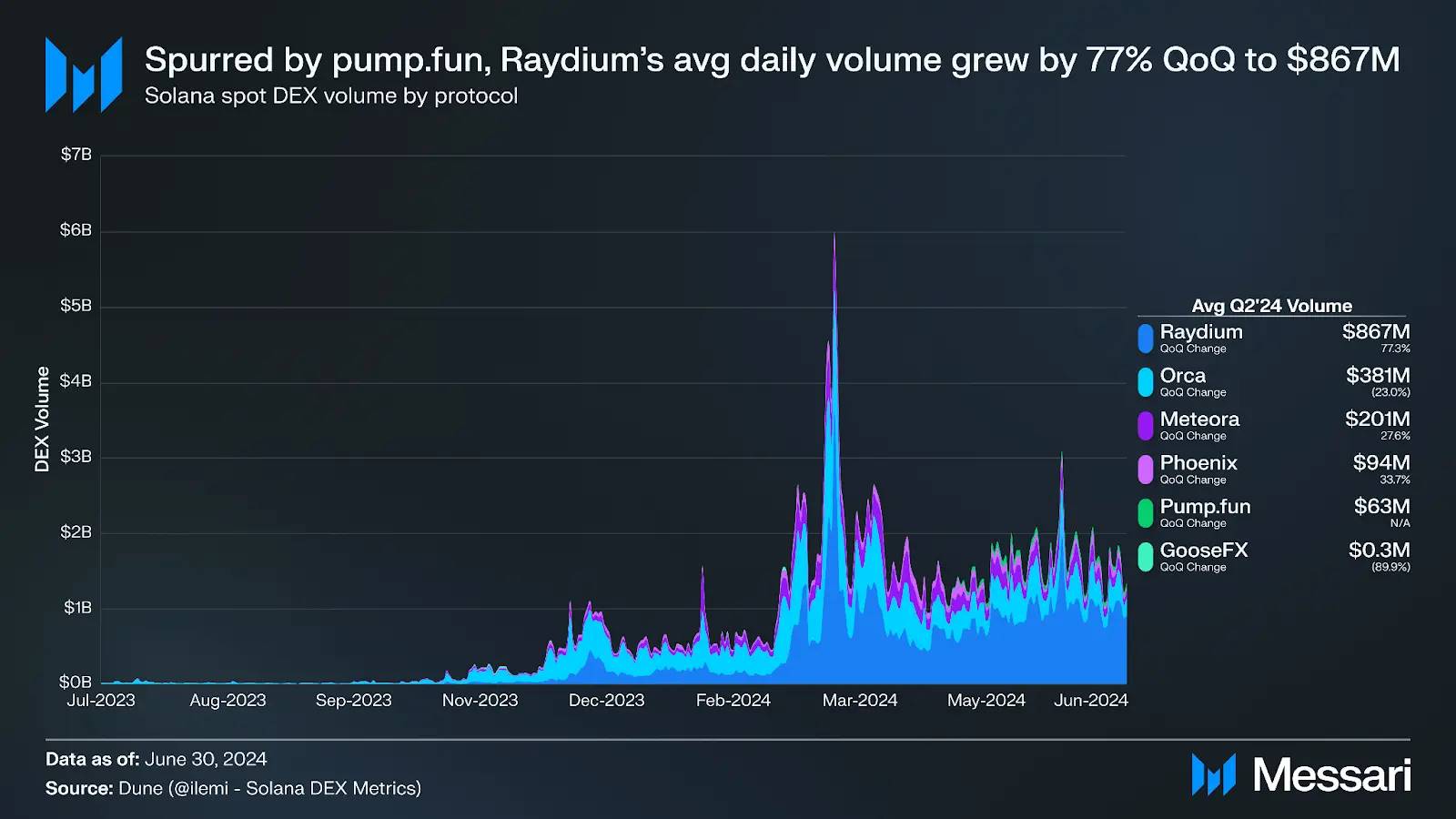 Raydium 是 pump.fun 的主要受益者,因为所有从 pump.fun 的债券曲线获得的流动性在代币达到市值门槛后都会转移到 Raydium。Raydium 的日均交易量环比增长 77% 至 8.67 亿美元,其市场份额从第一季度的 40% 上升到 54%。其 DeFi TVL 也环比增长 46% 至 9.91 亿美元,成为 Solana 上 TVL 最高的 DeFi 协议。在第二季度,Raydium 还发布了其 V3 用户界面,并推出了一个新的恒定产品 AMM 计划。