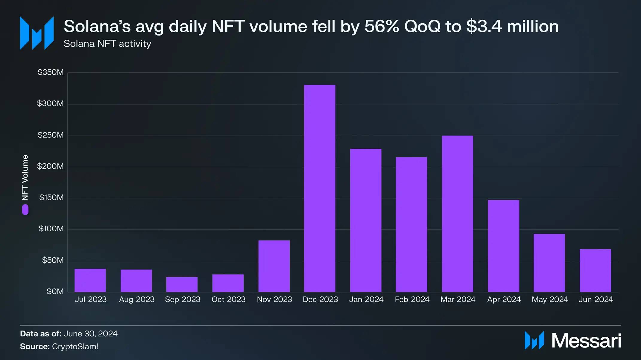 在经历了 2023 年底和 2024 年初的活跃期后,NFT 交易量在第二季度有所下降。日均交易量环比下降了 56%,降至 340 万美元。本季度,NFT 市场格局发生了变化,Magic Eden 重新夺回了大部分自然交易量份额,从 25% 增加到 59%。相反,Tensor 的市场份额从 71% 下降到 35%。