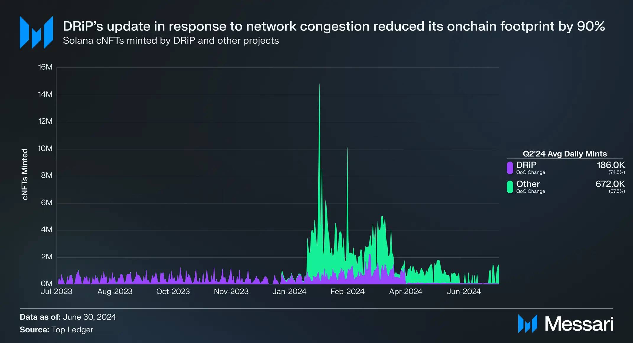 与其他应用程序一样,DRiP 的用户体验在 4 月初的网络拥堵中受到了影响。4 月中旬,它发布了一个更新来解决这个问题。现在,DRiP 只有在用户认领时才会在链上铸造收藏品,因此其日均铸造的 cNFT 数量减少了 90%。