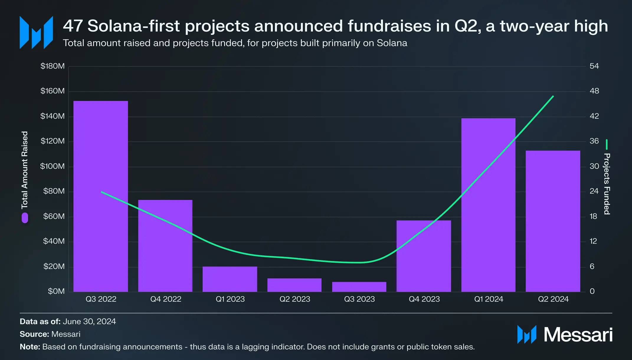在经历了长时间的熊市后,Solana 生态系统的融资正在回升。第二季度,有 47 个主要在 Solana 上构建的项目宣布了融资轮次,这是两年来的最高水平。这些项目共筹集了 1.13 亿美元,虽然环比下降了 19%。从 2023 年第四季度到 2024 年第二季度,Solana 项目共筹集了 3.09 亿美元,而前三个季度仅筹集了 3900 万美元。