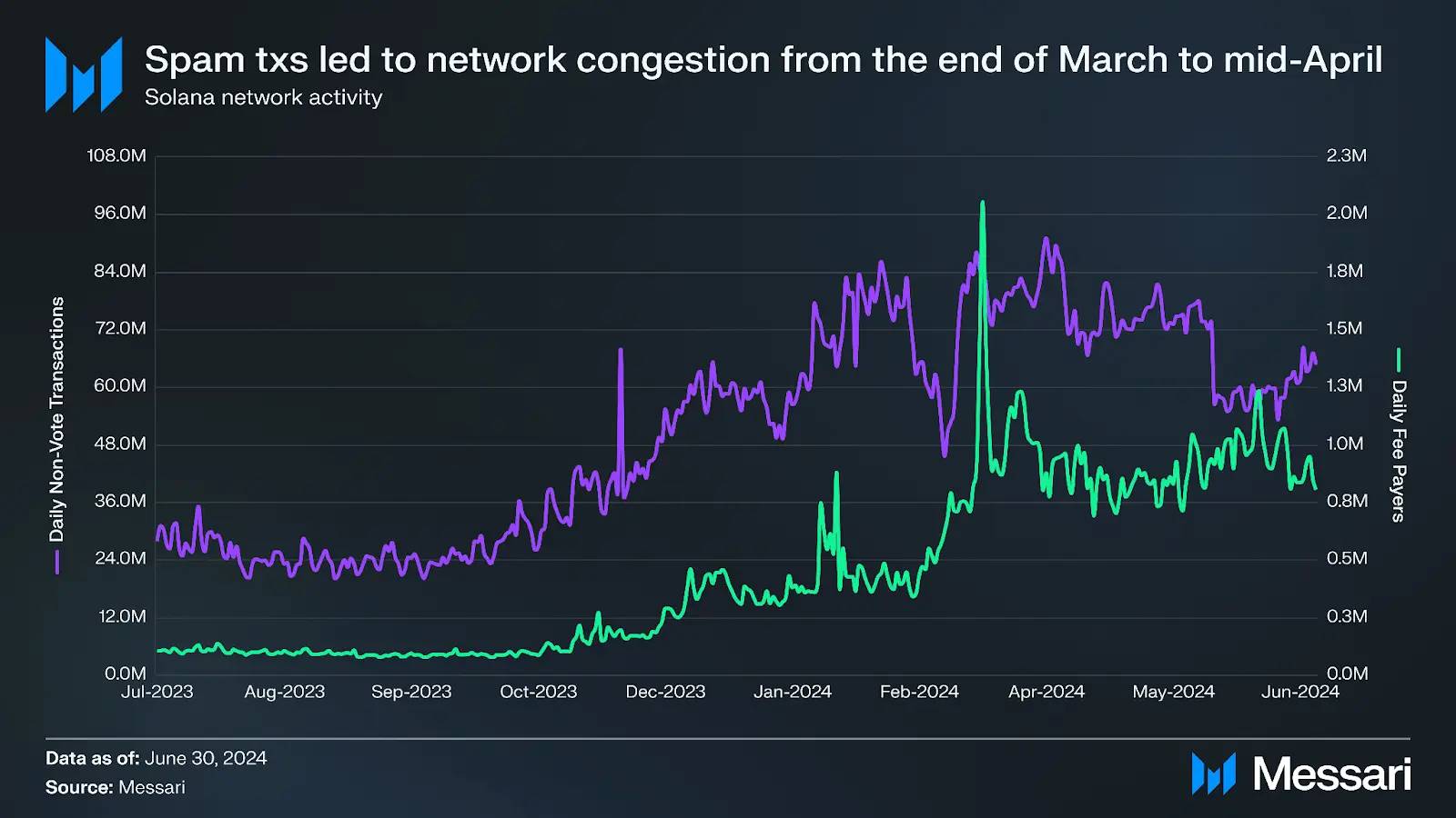 由 memecoin 活动和 Ore 挖矿引发的垃圾交易导致第二季度初网络拥堵。通过利用质押加权的服务质量 (QoS) 的 Agave 更新缓解了这一问题,并引入了对 SOL 的新结构性需求。