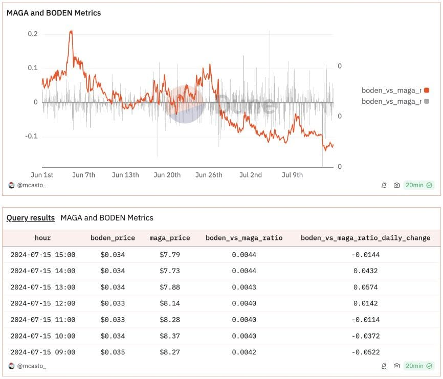 自六月初以来,两个最受欢迎的政治 memecoins,MAGA 和 BODEN 的价格走势一直相近。尽管六月的辩论后两者的表现没有明显差异,但在刚刚过去的周末,这两种资产的表现出现了有史以来最大的分化。