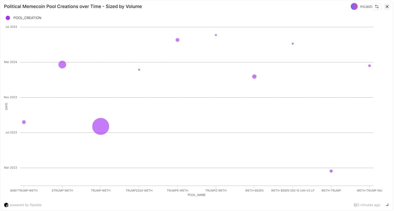 在以太坊和一些选定的 EVM 链上,按交易量计算,最受欢迎的特朗普和拜登 memecoins 是在政治 memecoin 叙述在五月获得关注之前推出的。随着叙述获得关注,更多的交易对被推出,早期的交易对有了显著的交易量。