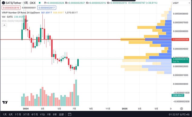 从周线上看,SATS 自 2 月末拉涨以后便持续下跌,至今已有 4 个月的时间,1000SATS 交易所部分建仓的底部成本在 0.00018 左右,当前底部上涨第二周走出趋势,冲击此前的成交密集区 0.0003 附近,下一个成交密集区在 0.0005 左右。