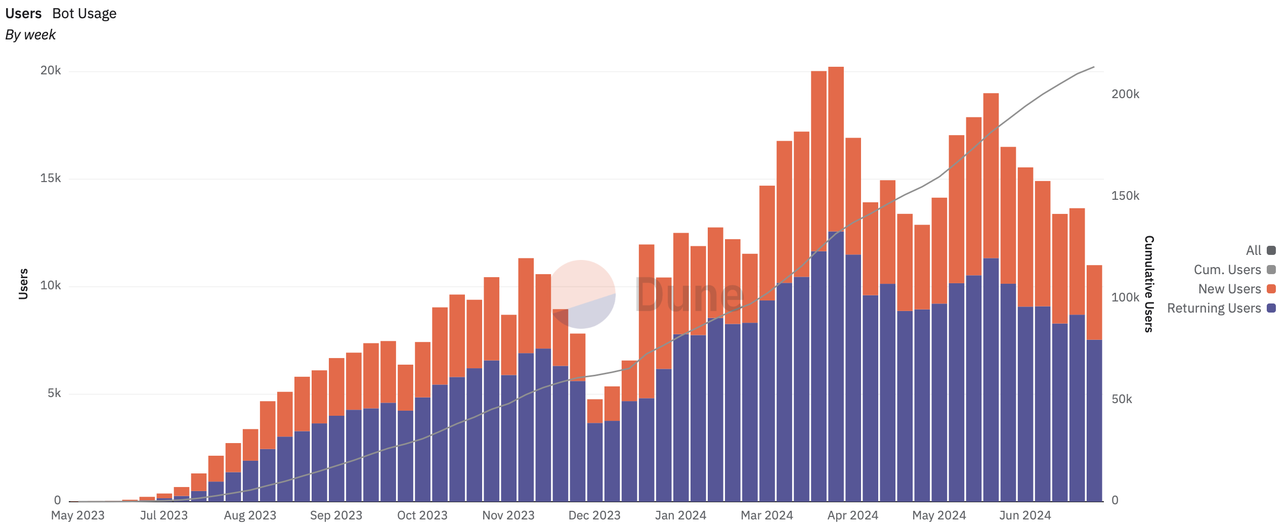 1. Bot 带来的自动式内嵌交互体验,用户可以通过点击、对话文本等形式促发既定需求的执行。以Trading Bot为例,伴随memecoin大热,通过Bot交互打新的方式,极大便利了用户的交易流程,就头部trading Bot应用数据显示近半年来每日新增用户超过1万,同时累积用户也突破20万。