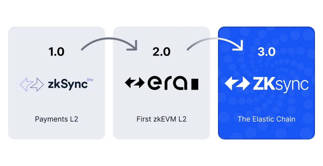 2023年 ZKsync 背后的主要开发公司Matter Labs 发布了他们的 ZK Stack,这是一个允许开发者在 ZKsync 技术基础上构建自己的区块链的工具包,从本质上讲这些定制链都将通过弹性链( Elastic Chain)相互连接,让ZKsync 3.0 从单个以太坊 L2 变为The Elastic Chain。