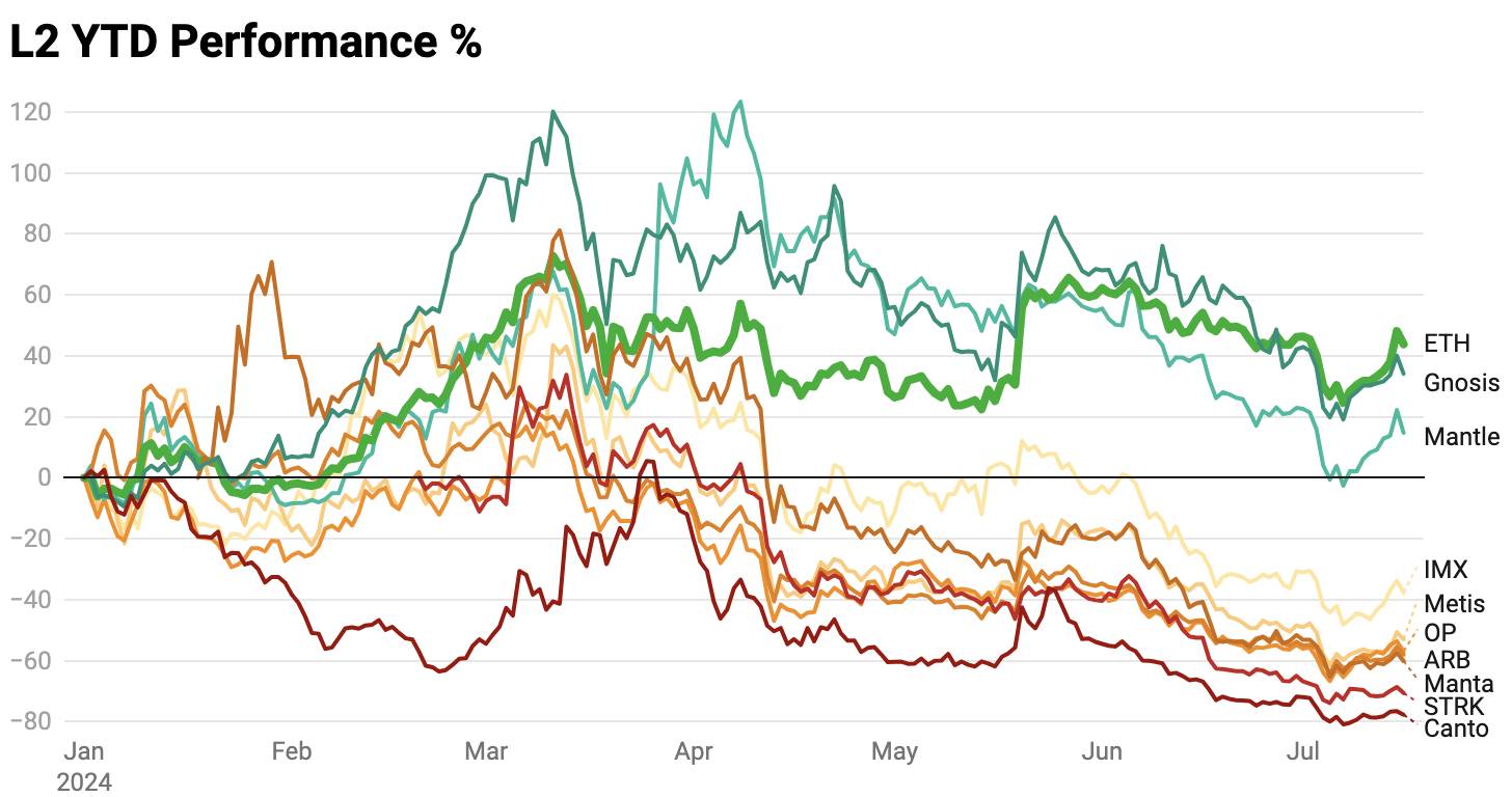 值得注意的是,没有一个 L2 代币在今年内表现超过 ETH,表现最好的 GNO 上涨了 34%,而 ETH 则上涨了 44%。表现最差的包括 MANTA、STRK 和 CANTO,今年都下跌了超过 60%。